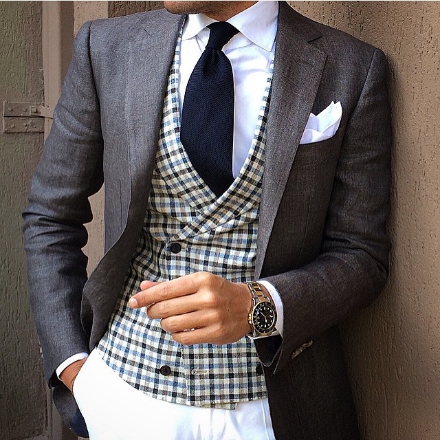 传统的西装时尚搭配是白色或浅蓝色衬衫配单色或有明亮图案的领带,这是永不过时的搭配,而且适合任何场合。正规的西装应该是三件套,包括外套、长裤和背心。